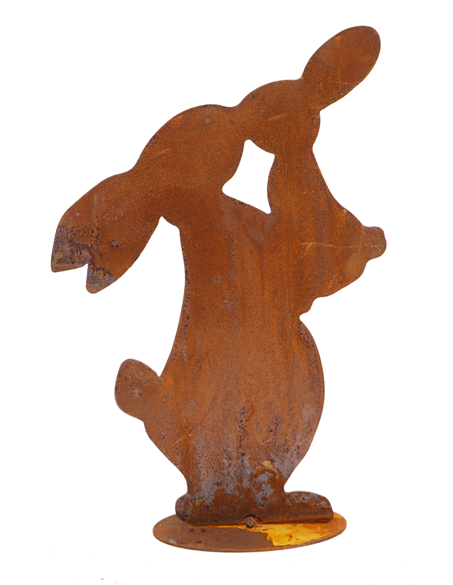 Edelrost Hase Karl auf Holzklotz zum Stecken, witterungsbeständig